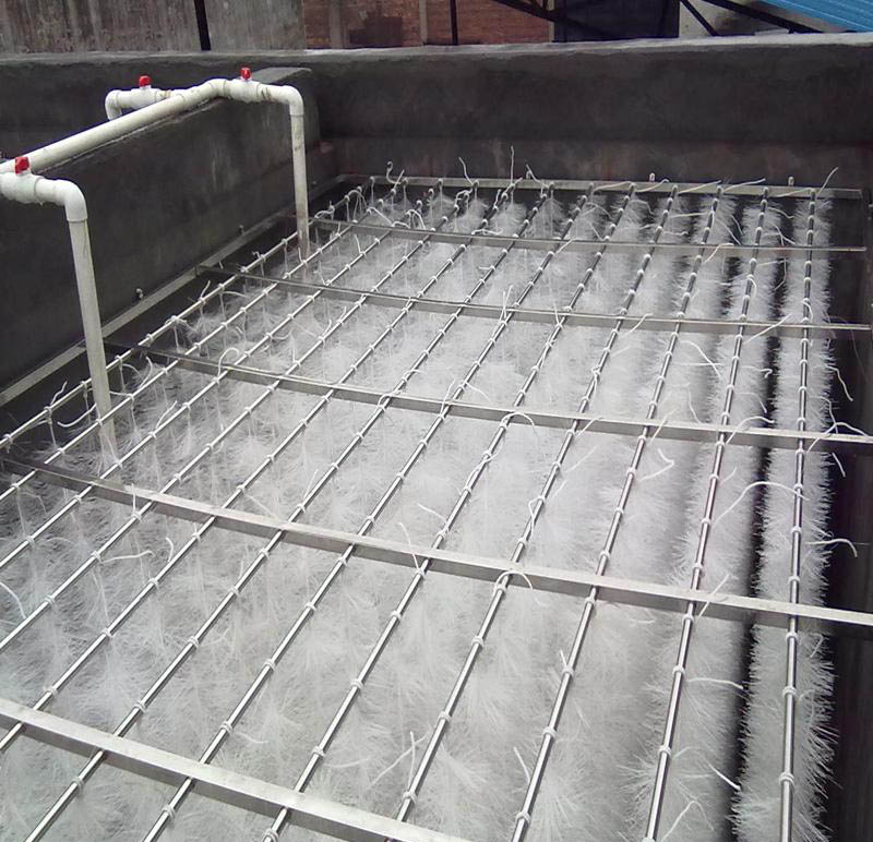 該填料篩選了聚烯烴類和聚酰胺中的幾種耐腐、耐溫、耐老化的優(yōu)質品種,混合以親水、吸附、抗熱氧等助劑,采用特殊的拉絲,絲條制毛工藝,將絲條穿插固著在耐腐、高強度的中心繩上,絲條布置應呈立體狀,絲條表面應有微波紋,由于選材和工藝配方精良,剛柔適度,使絲條呈立體均勻排列輻射狀態(tài),制成了懸掛式立體彈性填料的單體,填料在有效區(qū)域內能立體全方位均勻舒展?jié)M布,使氣、水、生物膜得到充分混滲接觸交換,生物膜不僅能均勻地著床在每一根絲條上,保持良好的活性和空隙可變性,而且能在運行過程中獲得愈來愈大的比表面積,又能進行良好的新陳代謝,這一特征與現(xiàn)象是國內目前其他填料不可比擬的。