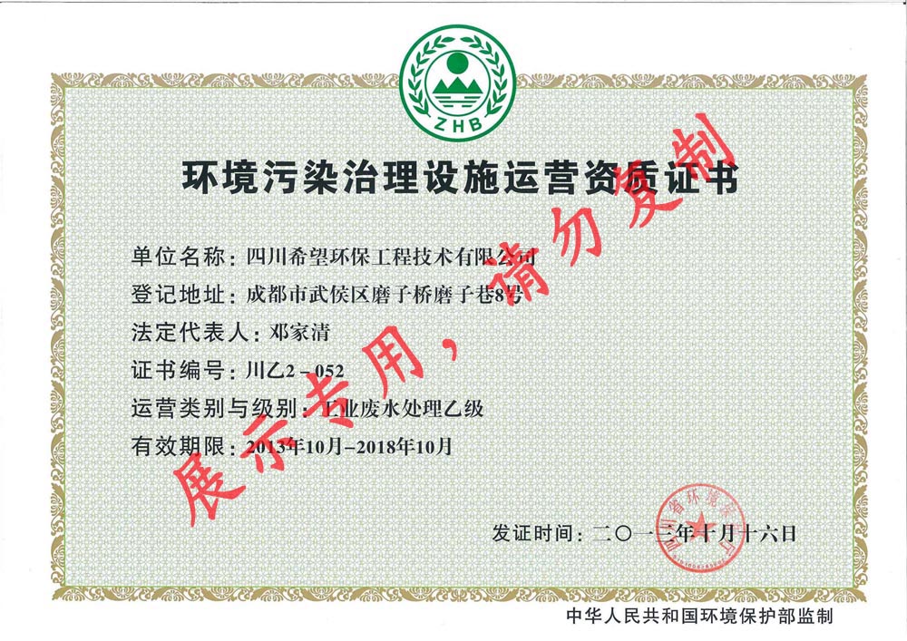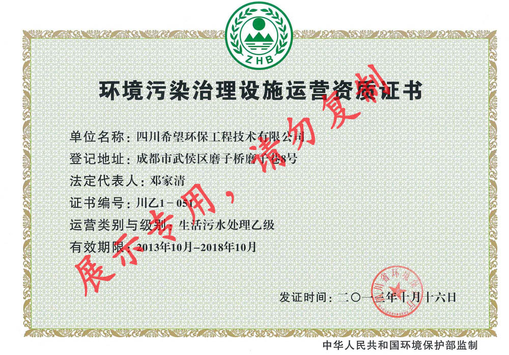 環(huán)境污染治理設(shè)施運(yùn)營(yíng)證書(工業(yè)和生活污水)